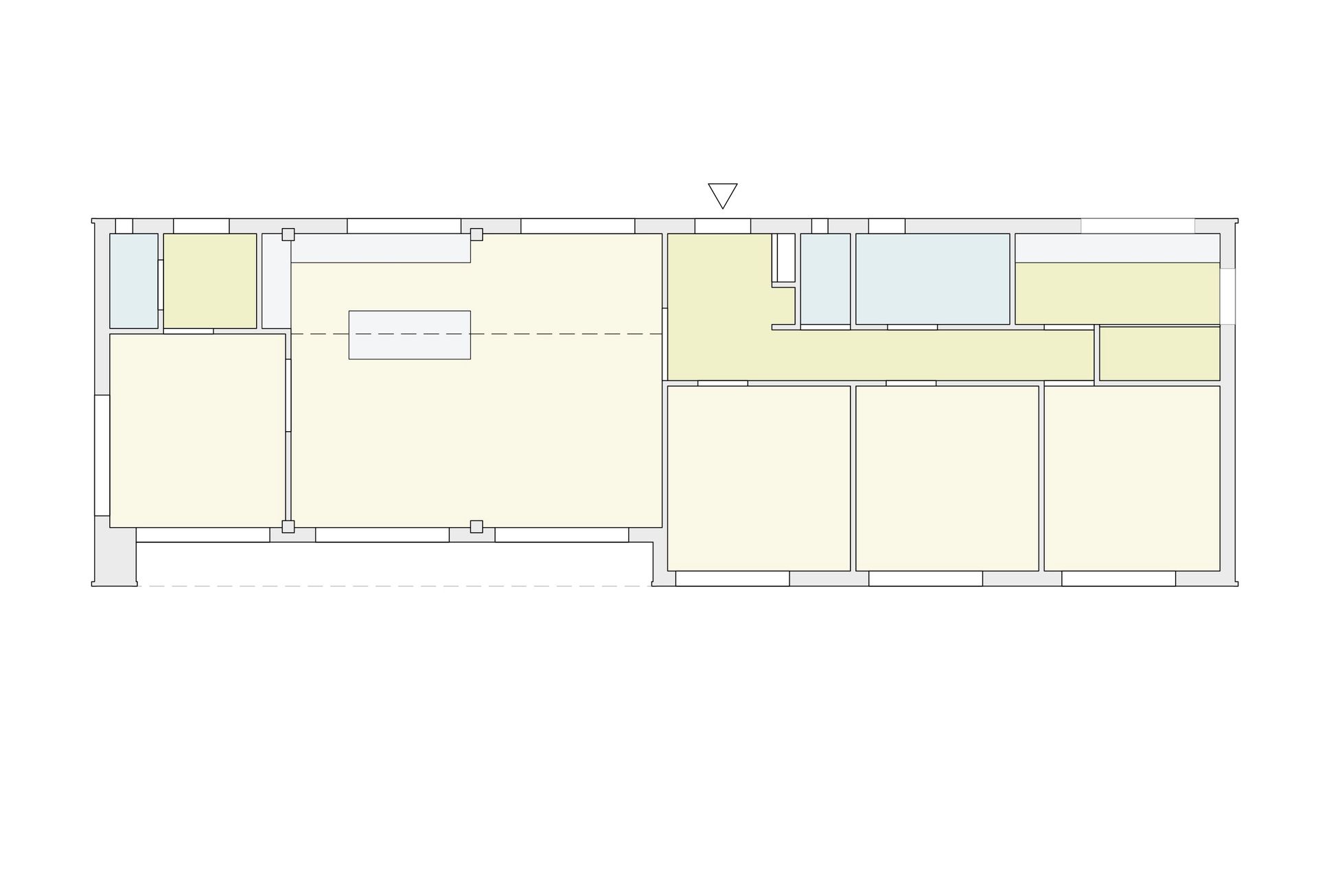 De woonruimte bestaat uit een zithoek, keuken en werkgedeelte. Deze woonruimte beslaat de helft van het volume. De andere helft wordt gevormd door drie slaapkamers aan de tuinzijde en een toilet, badkamer en bijkeuken/achteringang aan de straatzijde.