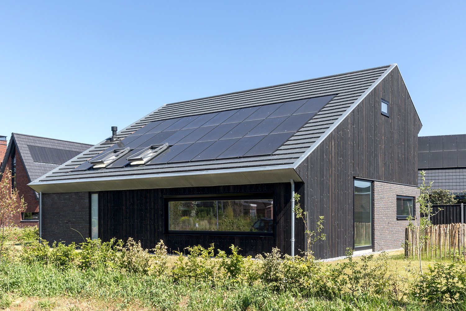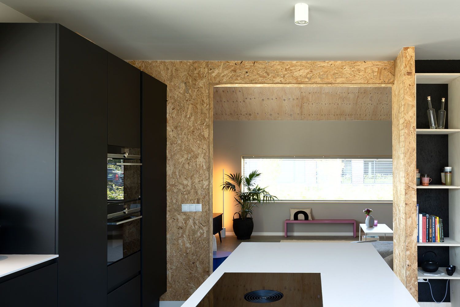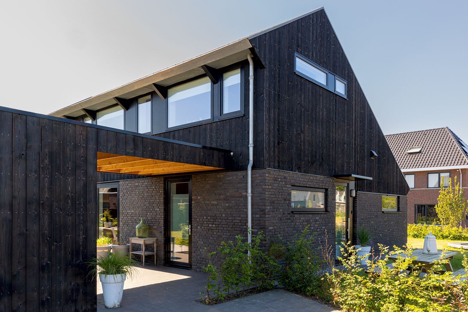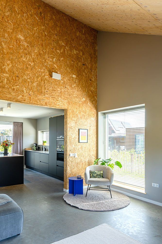 De woning is gebouwd middels een houtskelet-systeem. Waar mogelijk en functioneel is de constructieve OSB-beplating ook als afwerking in het zicht gebleven. Aan de buitenzijde springen de donkere houten gevelbekleding en scherpe zinken gootlijnen het meest in het oog.
