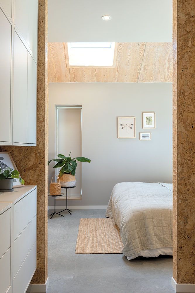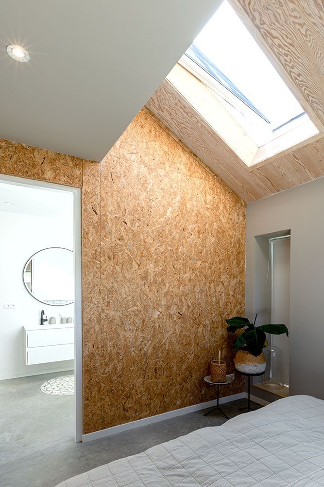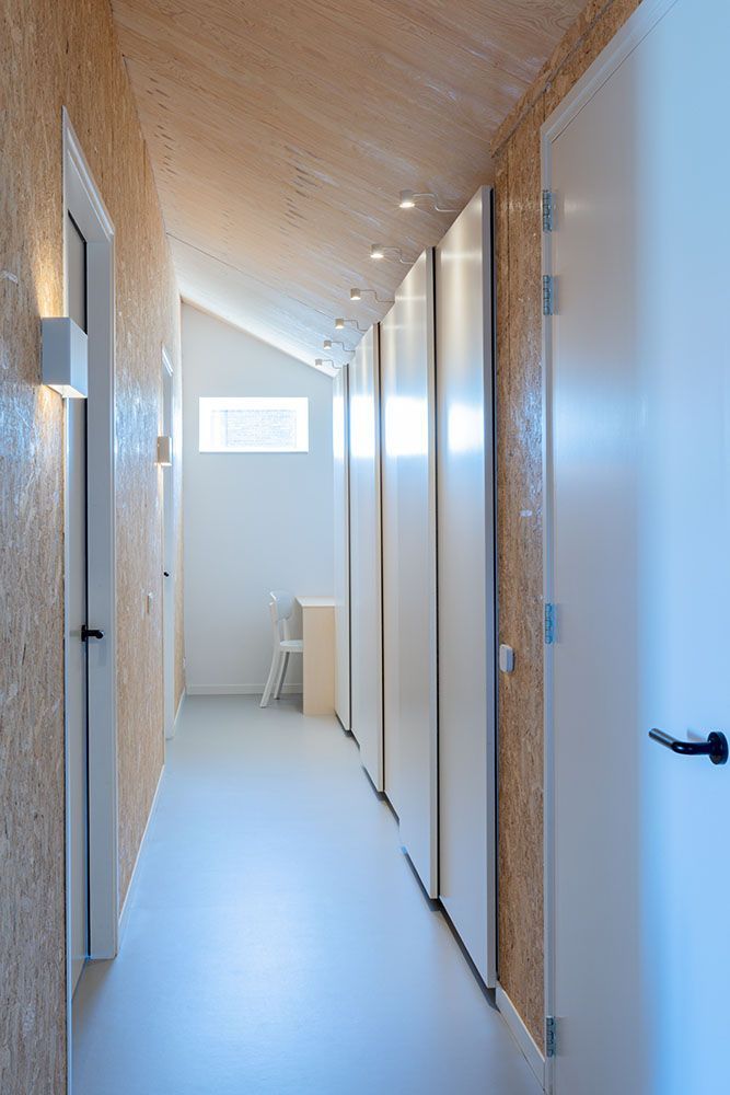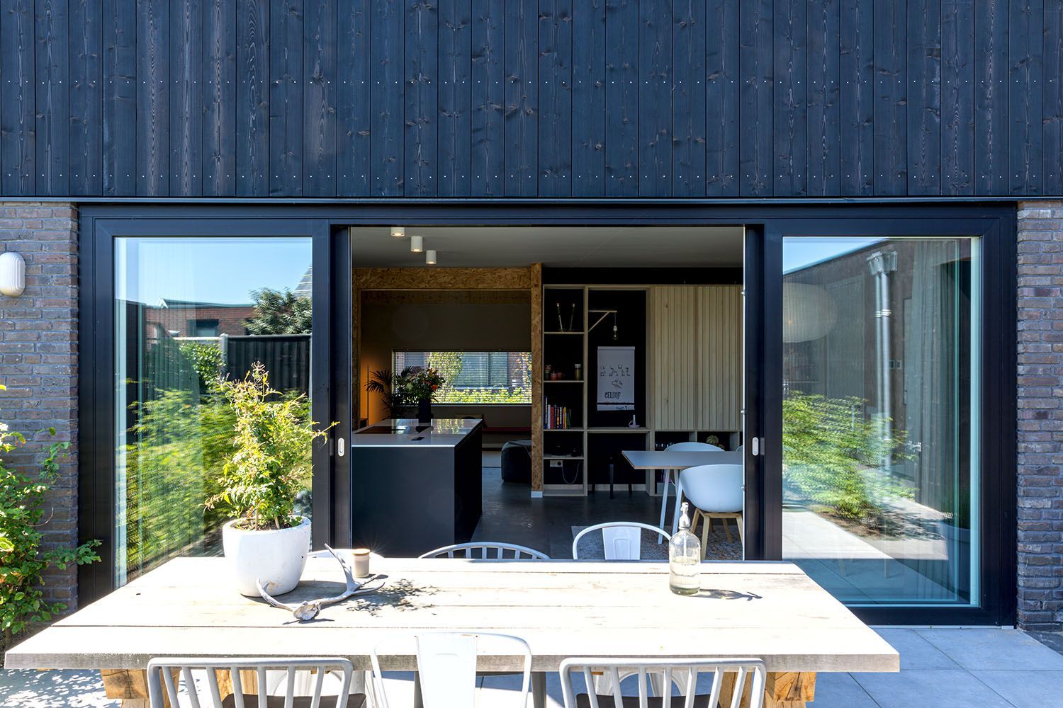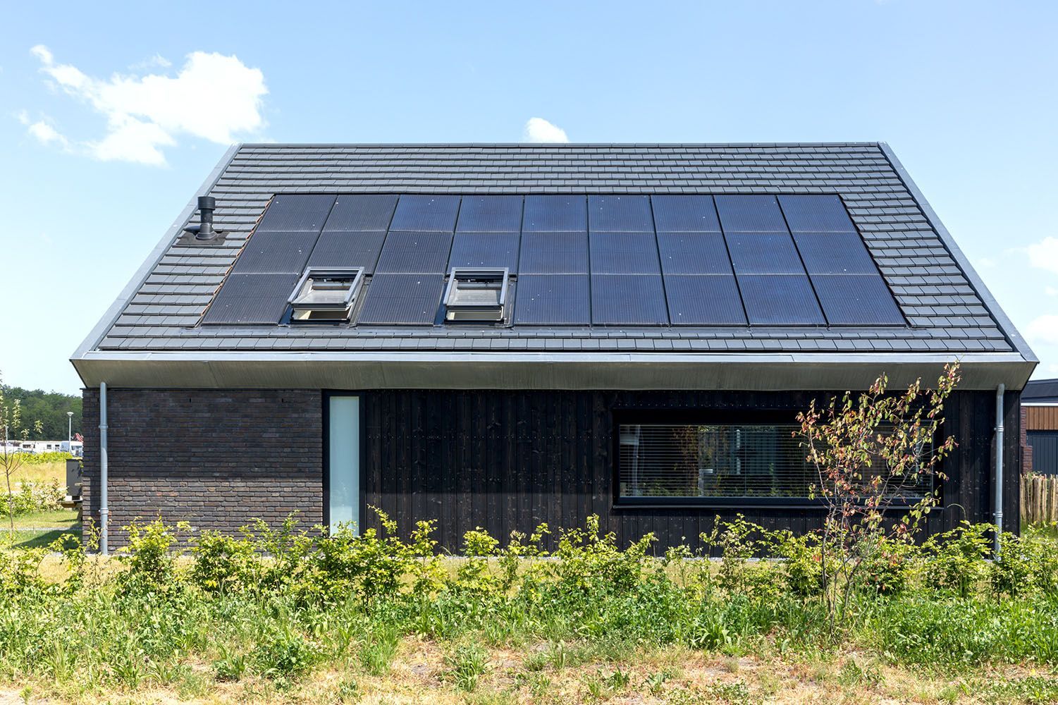 De woning is gebouwd middels een houtskelet-systeem. Waar mogelijk en functioneel is de constructieve OSB-beplating ook als afwerking in het zicht gebleven. Aan de buitenzijde springen de donkere houten gevelbekleding en scherpe zinken gootlijnen het meest in het oog.