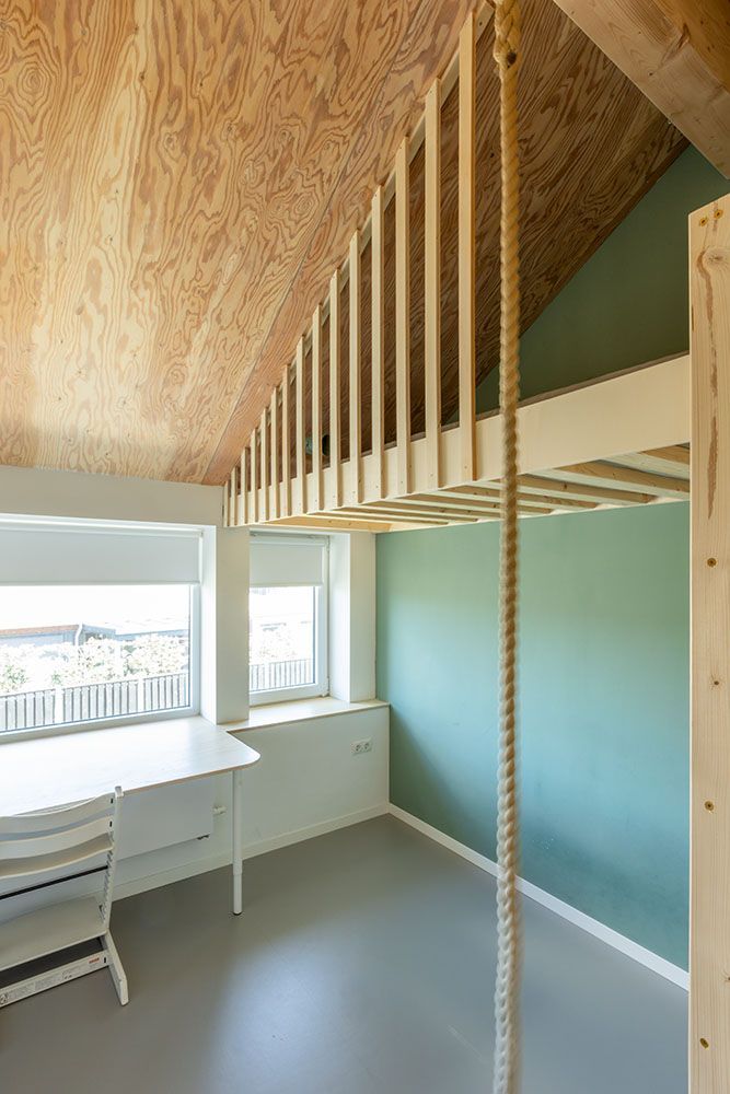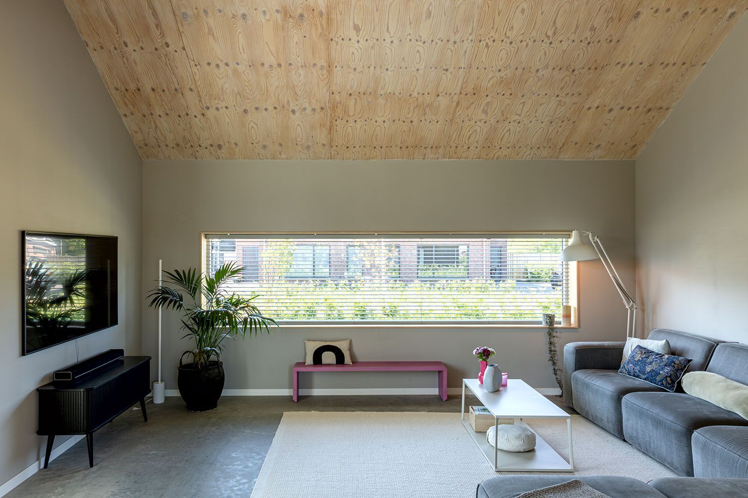 Het compacte huis heeft een ruime leefkeuken aan de tuin en een zitkamer aan de straat waar het schuine dak de ruimte karakter geeft. Aan de westzijde liggen de entree met bijkeuken en slaapkamer met badkamer. Op de verdieping liggen drie gelijkwaardige slaapkamers aan een lange overloop. Deze slaapkamers hebben ook weer iets eigenzinnigs door de vorm en hoogte.