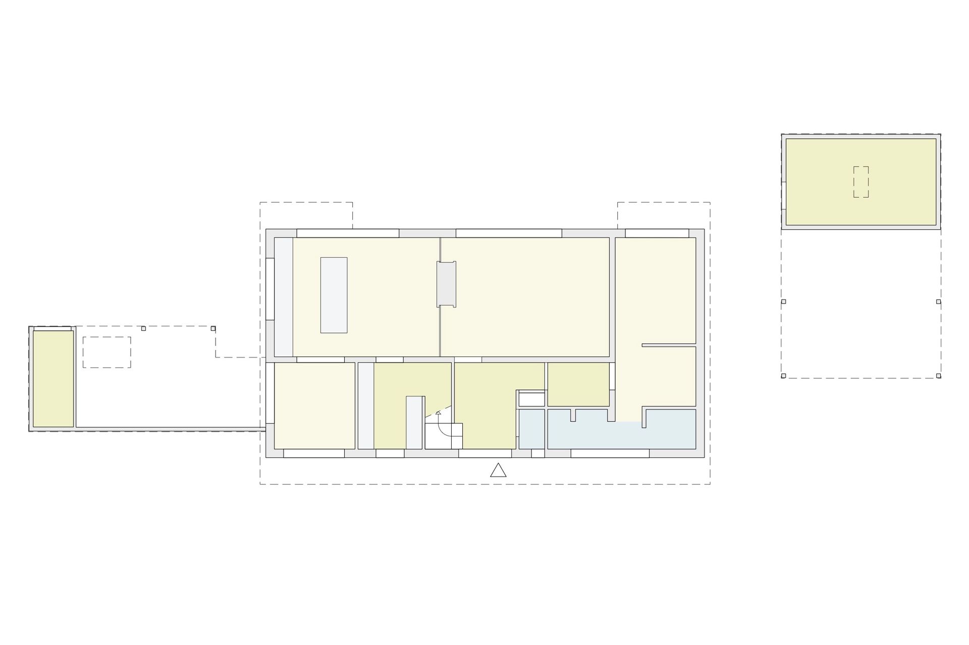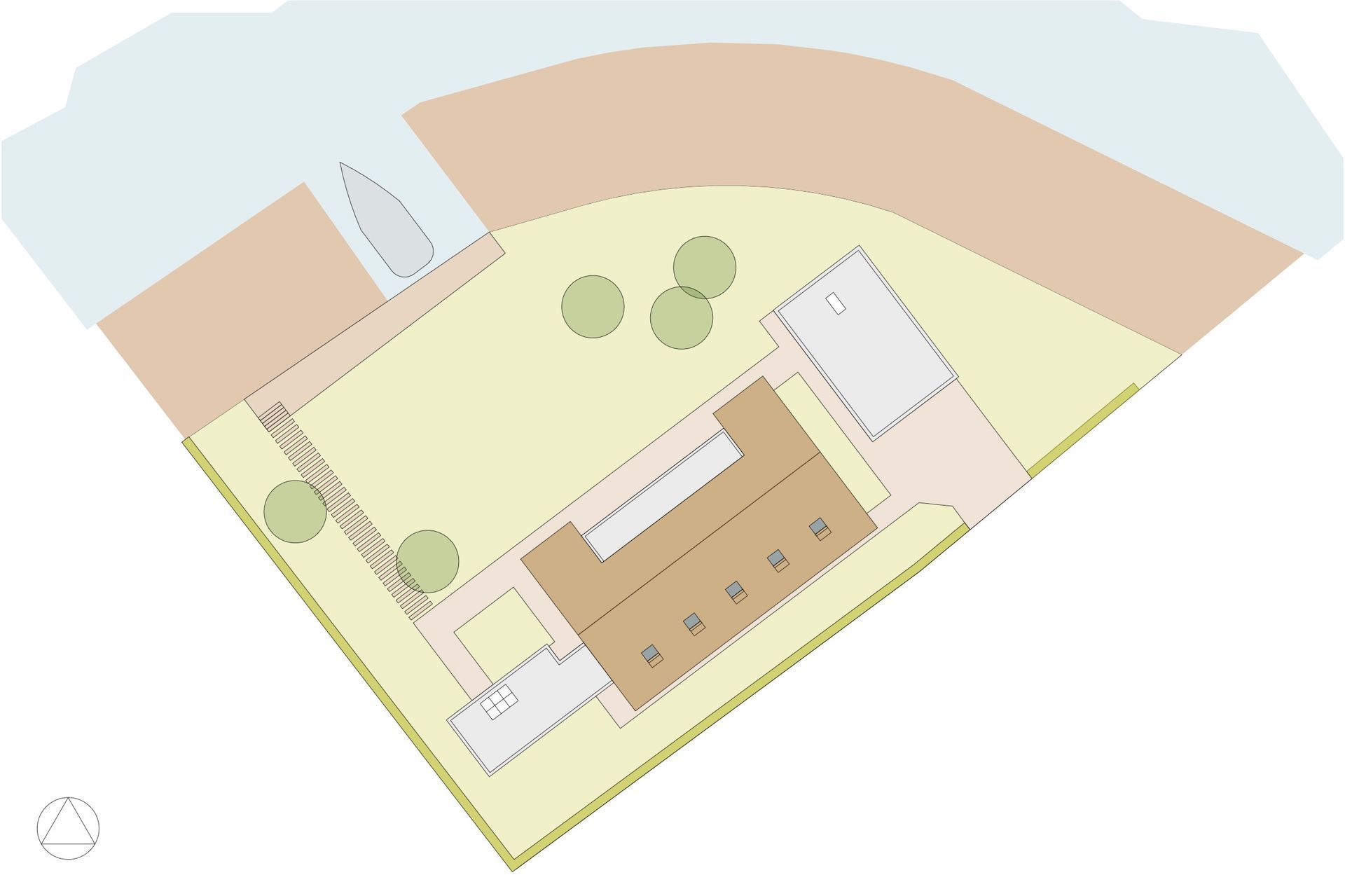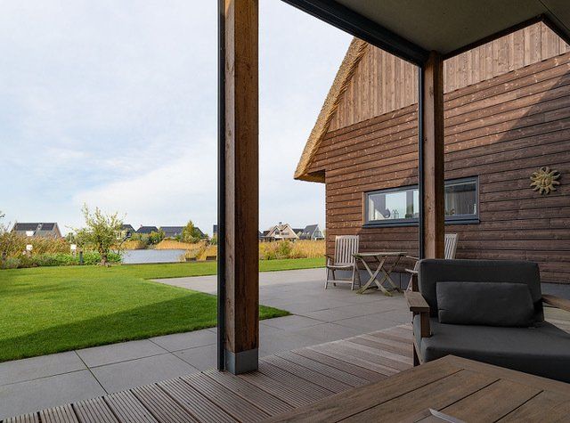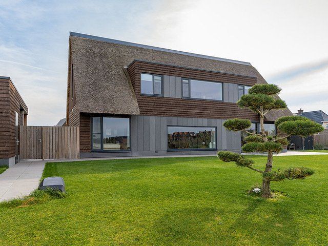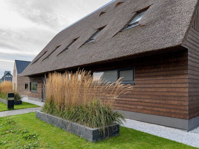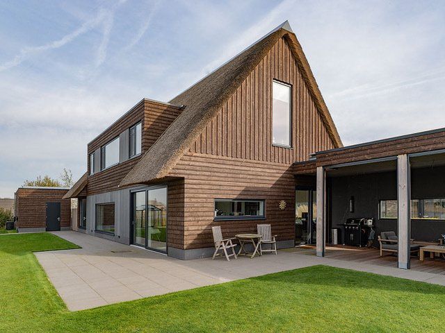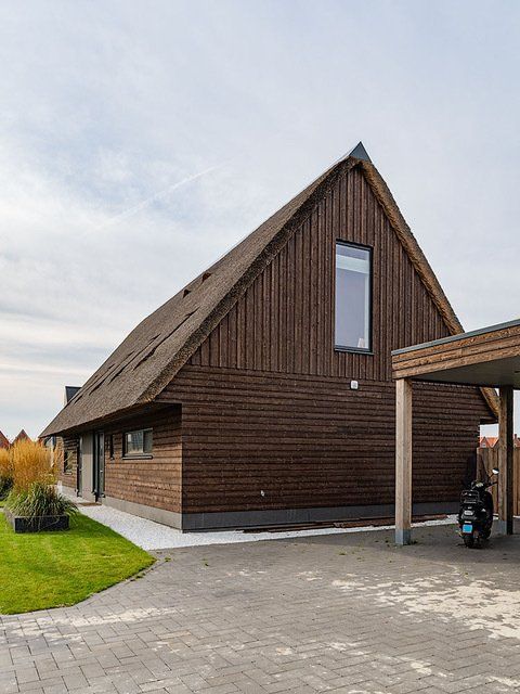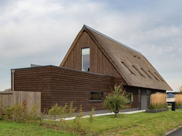De woning is volledig opgebouwd uit houtskeletwanden, -vloeren en -dak. De ruime overstekken van het met riet gedekte dak zorgen aan de weg- en waterzijde voor een fijne menselijke maat. De houten gevelbekleding op de begane grond versterkt die horizontaliteit, terwijl op de verdieping de kopgevels zijn voorzien van een boards-and-batten-bekleding van dezelfde houtsoort. De bekleding van de veranda aan de binnenzijde is van een grijze vezelcementplaat die terugkomt in de accentvlakken in de gevels.