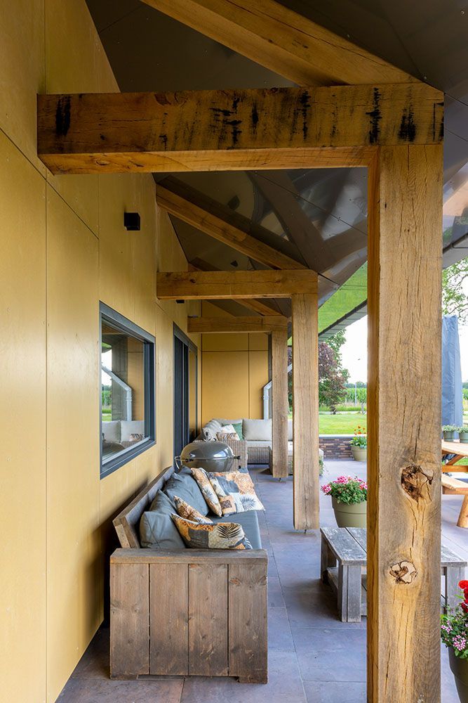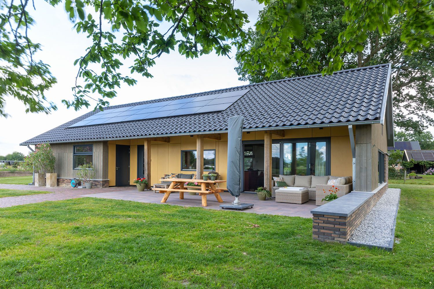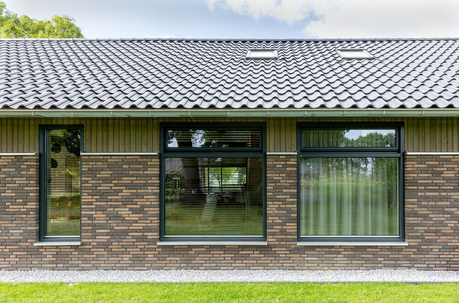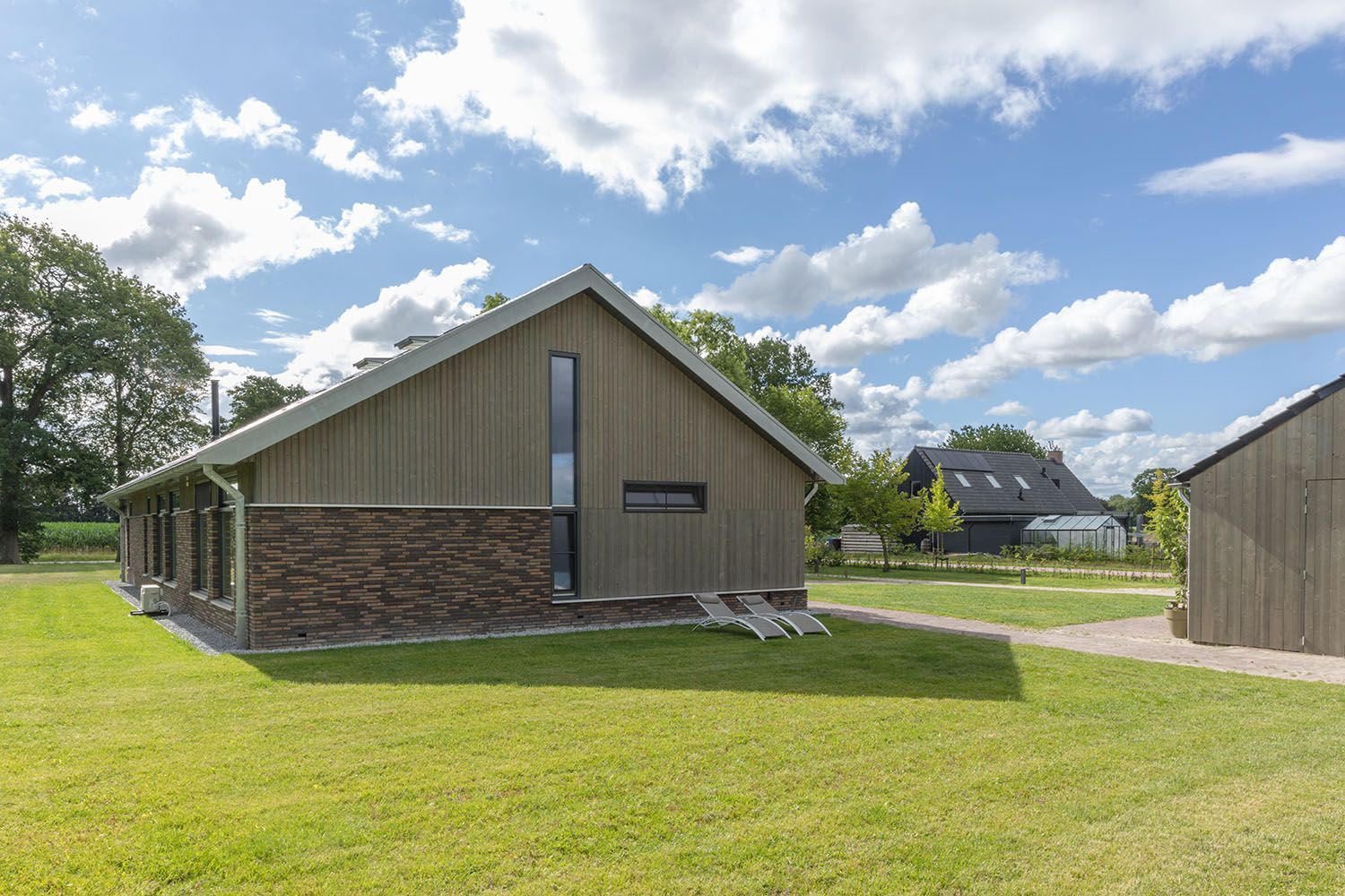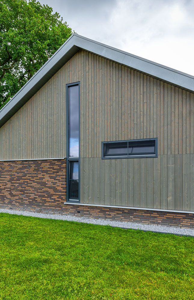 Het woonhuis en de schuur zijn geheel uit houtskelet opgetrokken. Een bruin-geel genuanceerde baksteen van Hilversums formaat zorgt voor een stoere en stevige onderbouw. Daarboven een open houten gevelbekleding van verduurzaamd hout in een halftransparante groene beits. De zinken dakgoten en windveren omranden de vlakke gebakken antraciete dakpannen op het zadeldak.