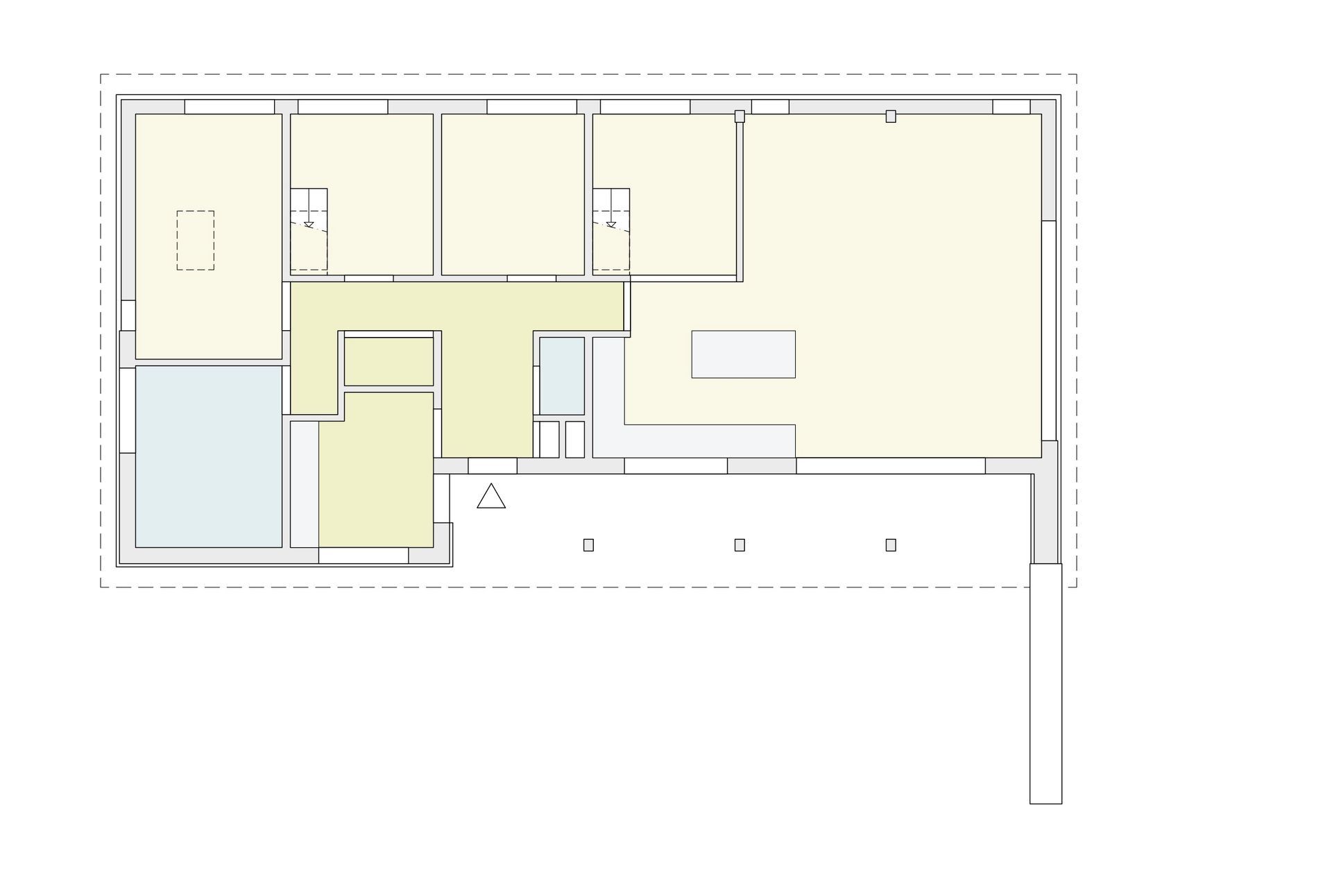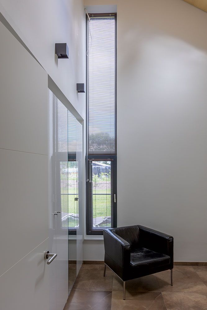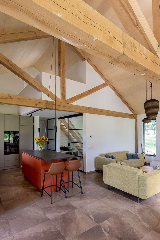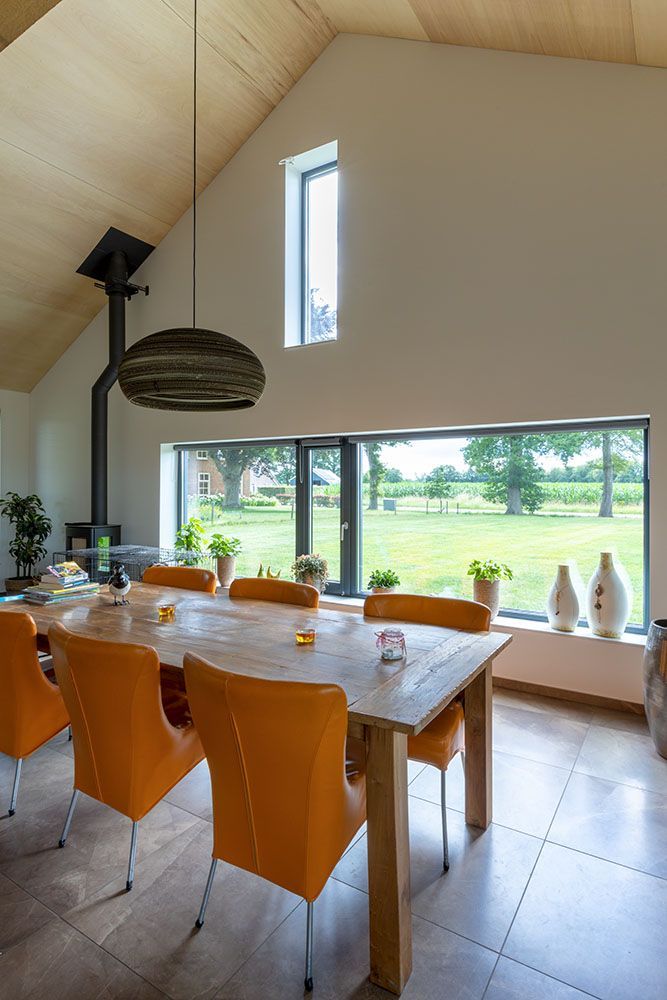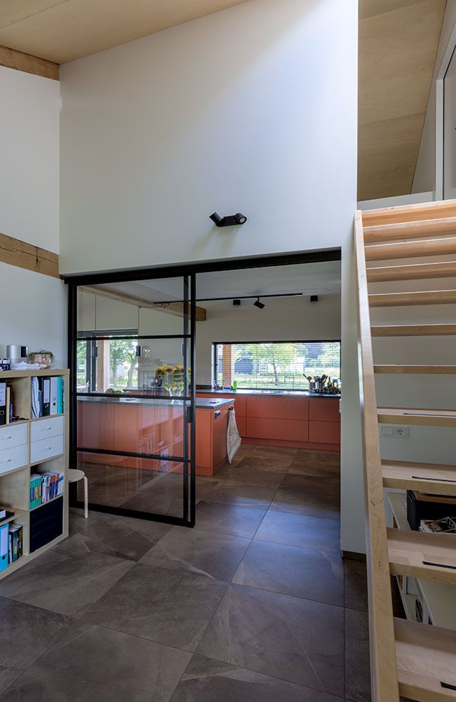 Het woonhuis heeft het gehele woonprogramma op de begane grond. De woonruimte optimaal op het uitzicht en de zon georiënteerd aan de zuidoostzijde met een overstek die de overgang naar de tuin markeert en een prettige, beschutte plek geeft. Deze woonruimte wordt vooral bepaald door de hoogte en het markante eikenhouten spant. Een kleine entresol ‘hangt’ als een balkon boven de woonkeuken. Het panoramavenster in de voorgevel vormt in het interieur een levensgroot schilderij. Aan de koelere noordzijde bevinden zich drie slaapkamers die deels ook profiteren van de grote hoogte.